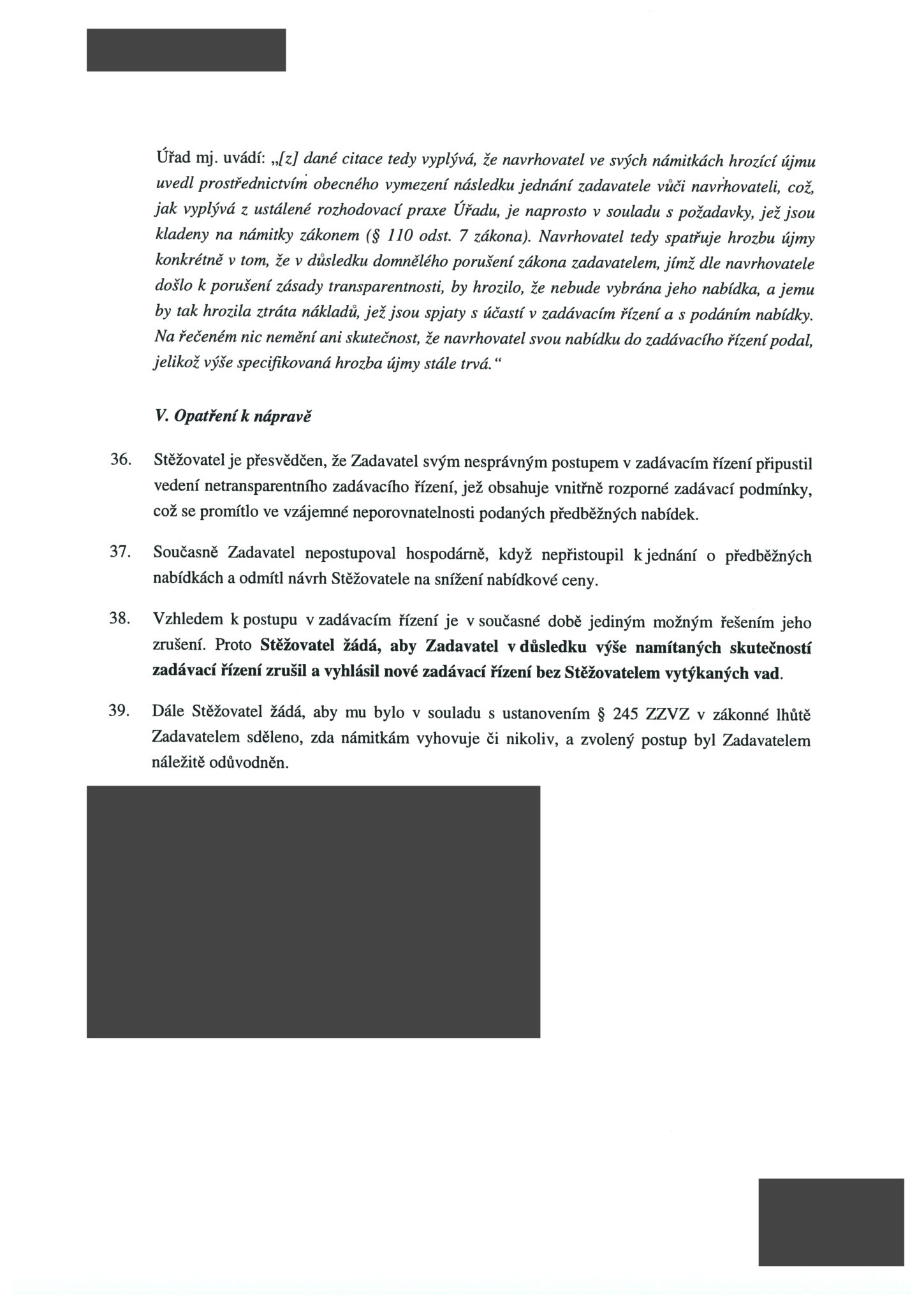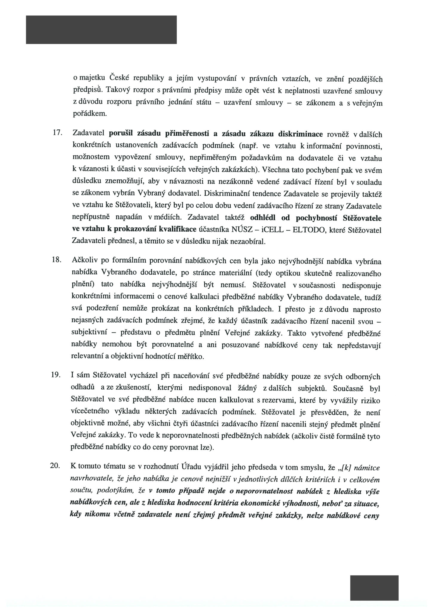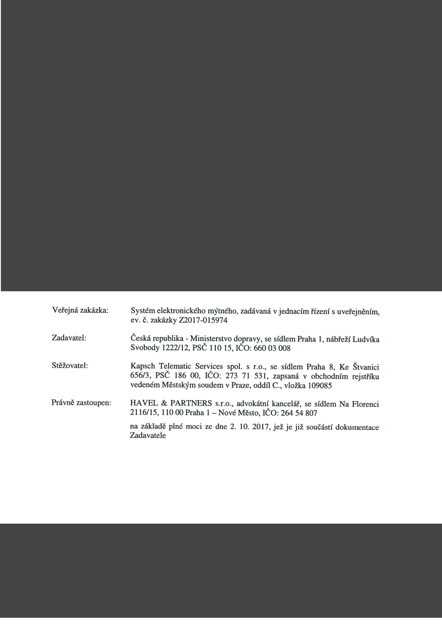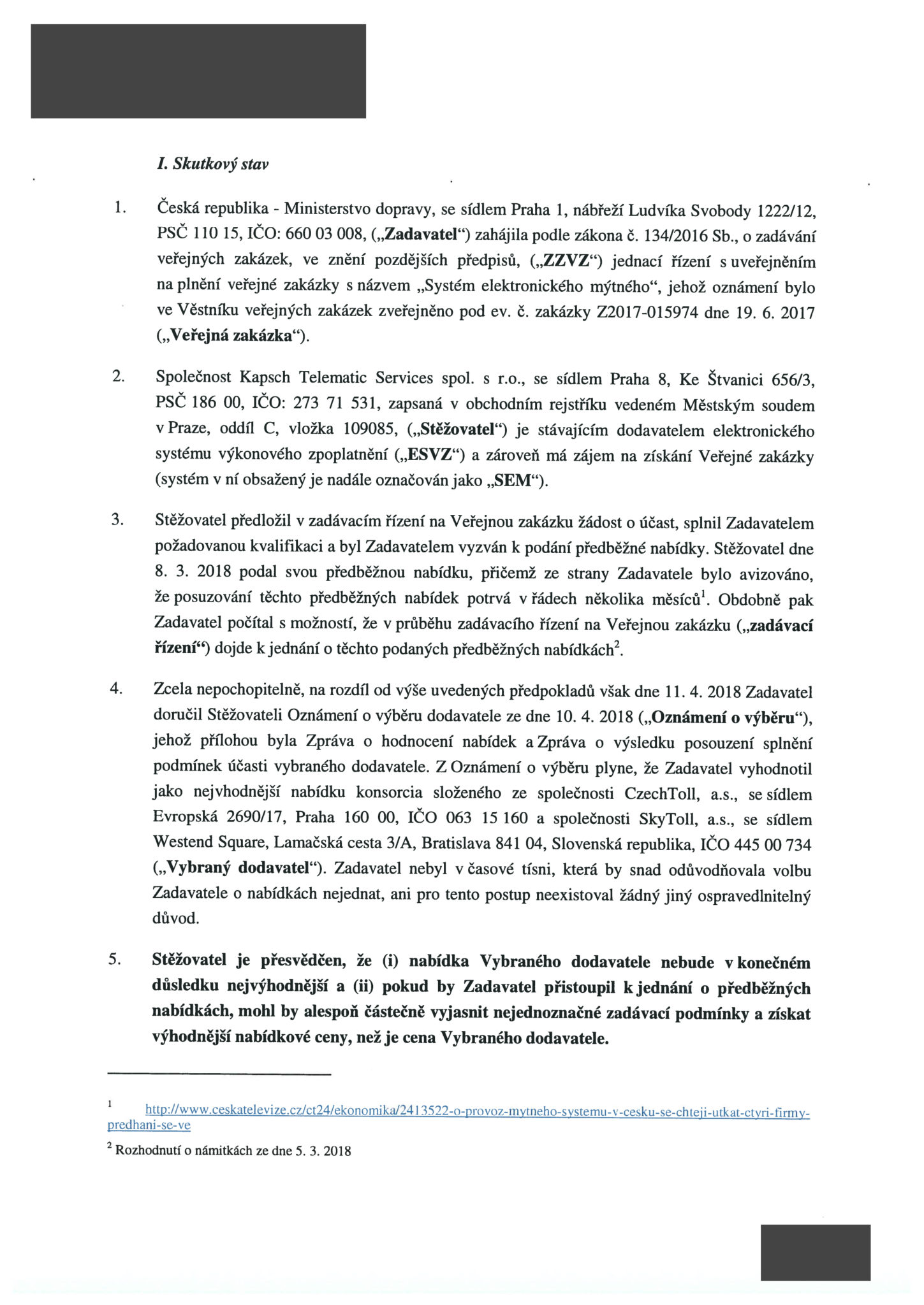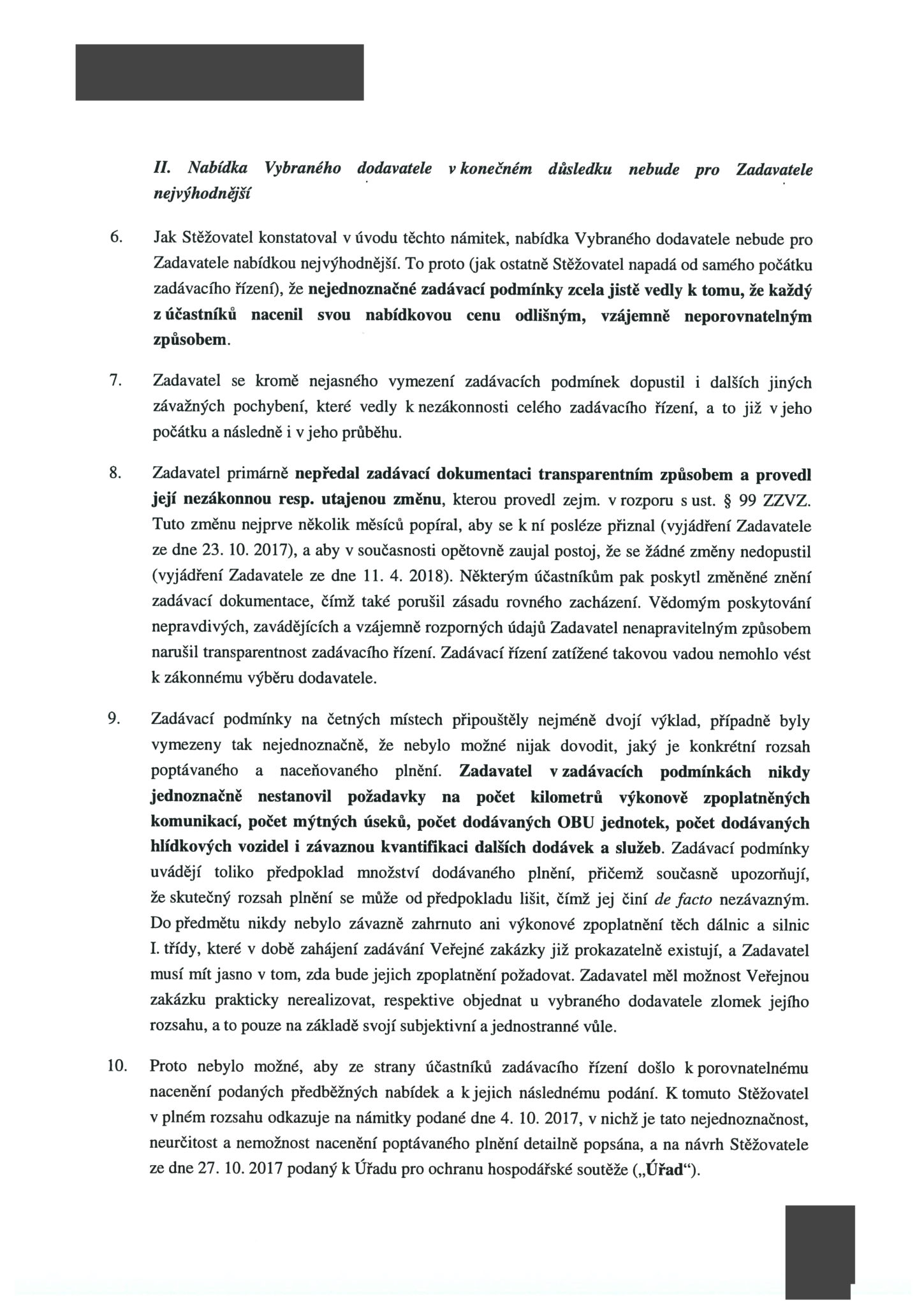 Kapsch také namítá, že zadavatel – ministerstvo dopravy – nepředalo zadávací dokumentaci transparentním způsobem a provedl její nezákonnou, respektive utajenou, změnu (flashdisky se začerněnými osobními údaji – pozn. red.) v rozporu s příslušným zněním zákona o zadávání veřejných zakázek. „Tuto změnu nejprve několik měsíců popíral, aby se k ní posléze přiznal, a aby v současnosti opětovně zaujal postoj, že se žádné změny nedopustil. Některým účastníkům pak poskytl změněné znění zadávací dokumentace, čímž také porušil zásadu rovného zacházení,“ stojí mimo jiné v podnětu rakouské globální společnosti.