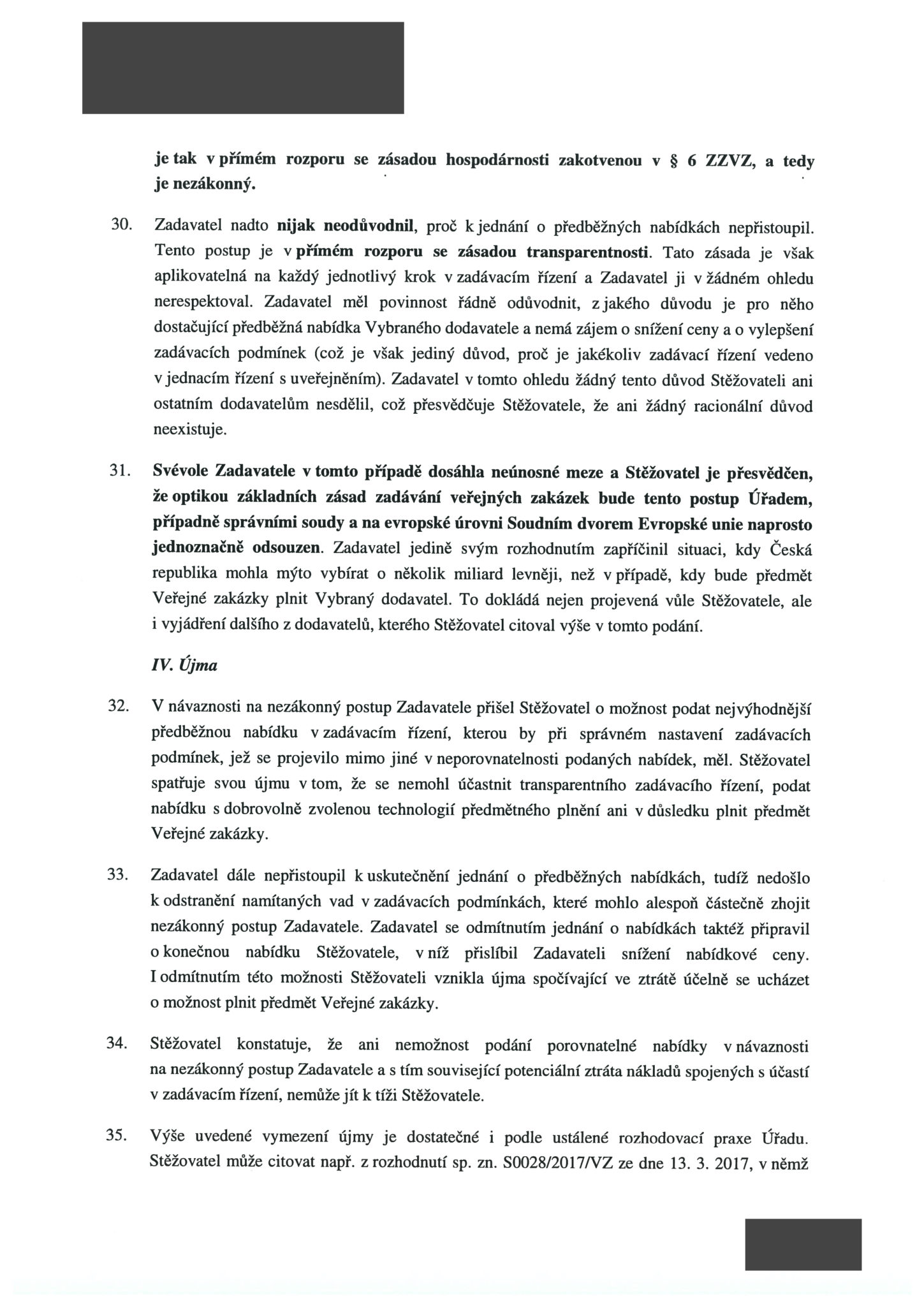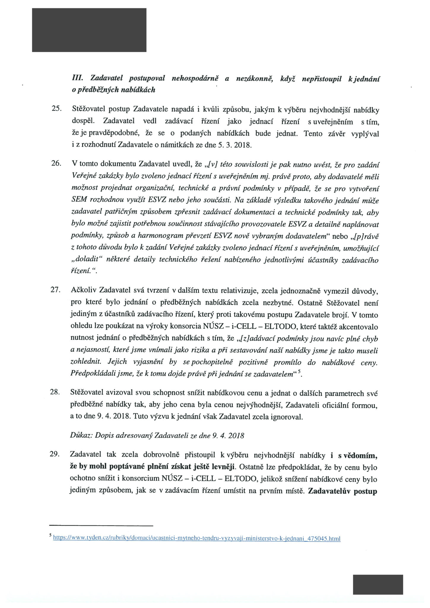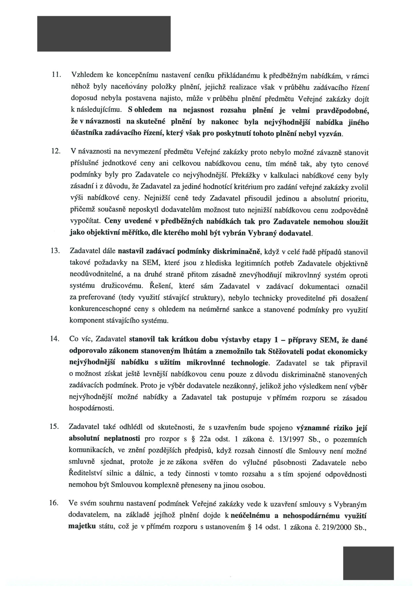„Pokud by zadavatel přistoupil k jednání o předběžných nabídkách, mohl by alespoň částečně vyjasnit nejednoznačné zadávací podmínky a získat výhodnější nabídkové ceny, než je cena vybraného dodavatele,“ stojí námitkách Kapsche. Firma zároveň upozorňuje na to, že nejednoznačné zadávací podmínky „zcela jistě vedly k tomu, že každý z účastníků nacenil svou nabídkovou cenu odlišným, vzájemně neporovnatelným způsobem“.