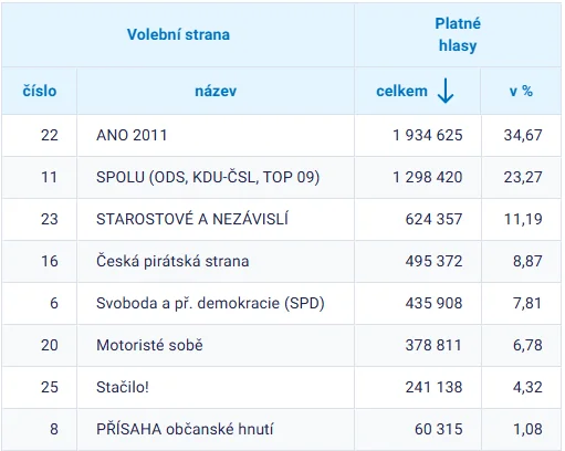 Jednoznačným vítězem voleb do poslanecké sněmovny je hnutí ANO bývalého premiéra Andreje Babiše. Po sečtení 99,64 procenta volebních okrsků má 34,7 procenta hlasů, což vychází na 80 mandátů v poslanecké sněmovně. Vítěz voleb již nastínil své další plány.