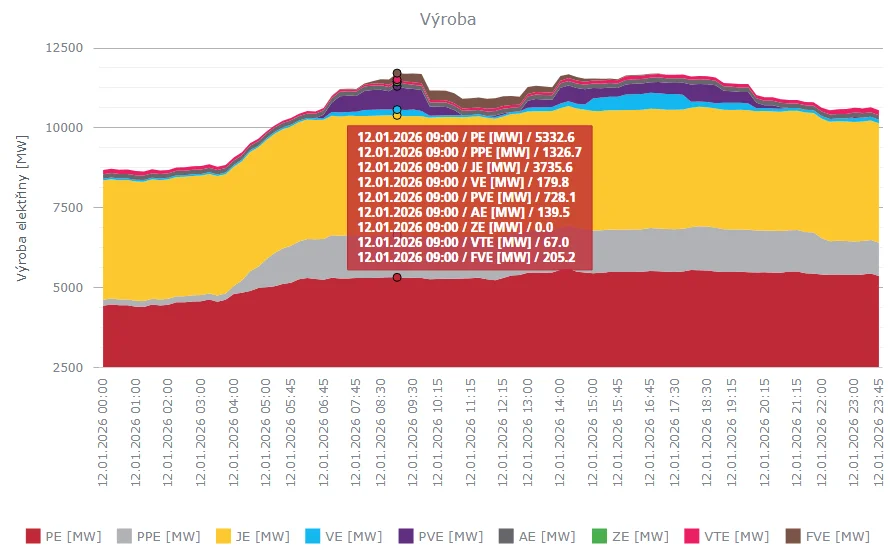 Podíl zdrojů na výrobě elektřiny v pondělí 12.1.2026 v ČR. Hlavní podíl měly parní (uhelné) a jaderné elektrárny, třetí místo patří plynovým zdrojům. Zdroj: ČEPS