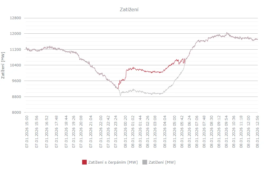 Spotřeba elektřiny v Česku 8. ledna 2026. Zdroj: ČEPS