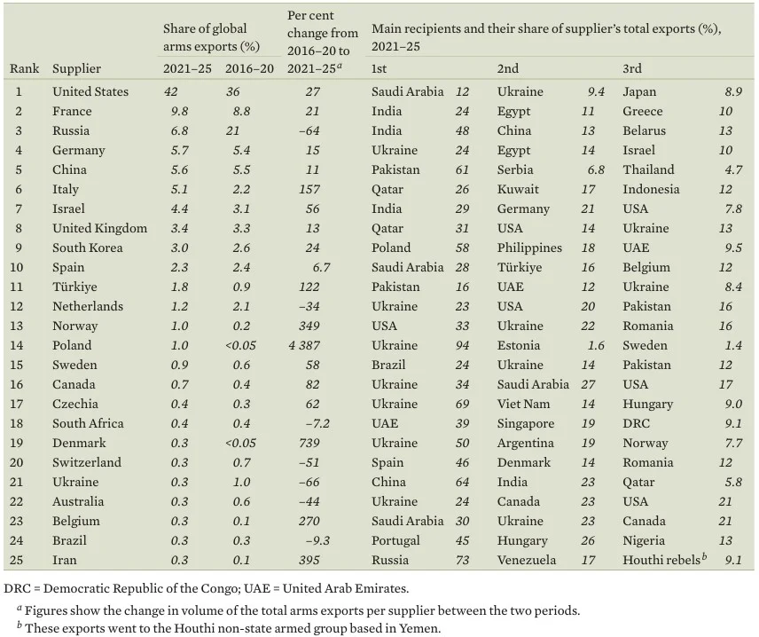 „Ačkoli evropské firmy zvýšily výrobu zbraní a nová investiční podpora Evropské unie pro zbrojní průmysl členských států vedla k řadě objednávek uvnitř EU, evropské státy pokračovaly v dovozu amerických zbraní v letech 2021–25, zejména bojových letadel a systémů protivzdušné obrany s dlouhým doletem,“ vysvětluje Katarina Djokić z programu SIPRI.