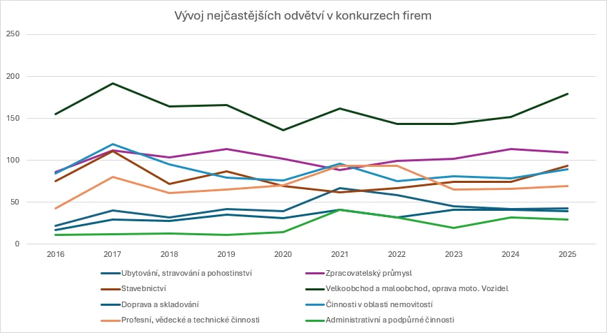 Právě teď tak podle něj v počtu insolvencí a konkurzů dobíhá propad ekonomiky z roku 2023. Firmy se snažily přežít díky úsporám, odkládání splátek nebo toleranci věřitelů. „Trpělivost věřitelů – s výjimkou bankovního sektoru – je dost velká,“ poznamenává Dufek.