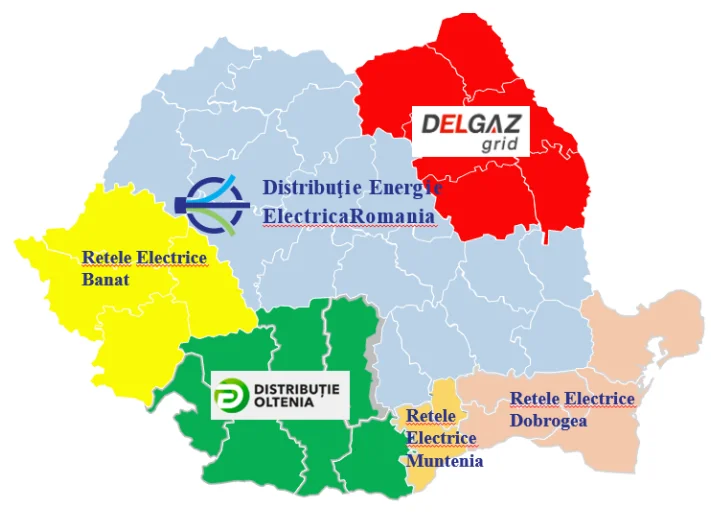 Mapa distribučních sítí na území Rumunska. Distributie Oltenia pokrývá jihozápad země. Zdroj: Electrica