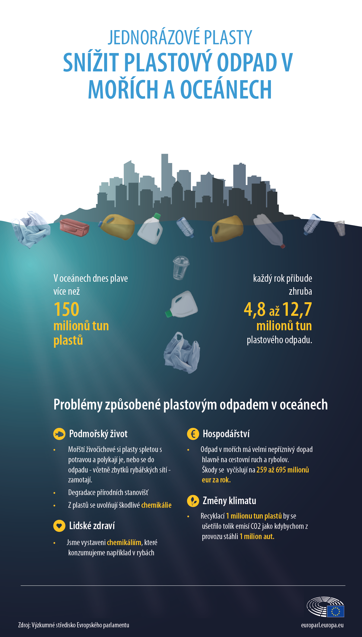 Plasty v oceánech nejsou podle Komise problémem jen kvůli znečištěným plážím, ale hlavně kvůli ničivému vlivu na mořské živočichy, kteří se do větších kusů odpadu zamotávají a ty menší si pletou s potravou. Požití plastů je může přímo zabít nebo tím mohou do svého těla vstřebat toxické chemické látky. Plasty a s nimi spojené chemikálie tak nakonec konzumují i lidé. Plastový odpad má rovněž negativní ekonomický vliv na odvětví a lidi, jejichž obživa závisí na moři. Přibližně jen pět procent plastových obalů se znovu využije, zbytek se vyhodí. Vícenásobné využití obalů by přitom bylo výhodné i pro výrobce.