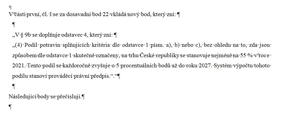 „V § 9b se doplňují odstavce 4 až 6, které znějí: Provozovatel potravinářského podniku, který uvádí na trh potraviny konečnému spotřebiteli, je povinen v provozovně s prodejní plochou potravin větší než 400 m2 zajistit, aby ze všech spotřebiteli na prodejní ploše nabízených prodejních položek potravin uvedených v prováděcím právním předpise byl nabízen minimální podíl prodejních položek potravin uvedených v prováděcím právním předpise, které mají místní nebo regionální původ z krátkého dodavatelského řetězce, za který se považuje původ potraviny z České republiky podle čl. 60 nařízení Evropského parlamentu a Rady (EU) č. 952/2013, kterým se stanoví celní kodex Unie, nebo splňují certifikovaná schémata kvality nařízení Evropského parlamentu a Rady (EU) č. 1151/2012 o režimech jakosti zemědělských produktů a potravin.“