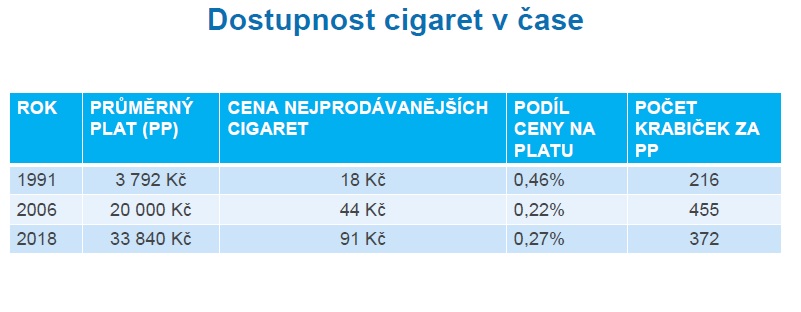 Zatímco v roce 1991 stály nejprodávanější cigarety 18 Kč, loni to bylo 91 korun. Ale vzhledem k výši platu si po revoluci mohli za průměrný plat koupit 218 cigaret, loni to bylo 372 kusů cigaret. „Aby se tento nepoměr vyrovnal, musela krabička cigaret stát okolo 150 korun,“ řekla Králíková.