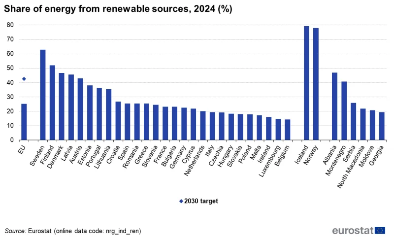 Jak informoval Eurostat, země EU dosáhly v roce 2024 podílu obnovitelných zdrojů na hrubé konečné spotřebě energie 25,2 procenta. To je přibližně o 0,7 procentního bodu více než v roce 2023 a téměř třikrát více než v roce 2004. Cíl Evropské unie spotřebovat v roce 2030 nejméně 42,5 procenta energie z OZE se s přihlédnutím k tempu rozvoje zelené energetiky v posledních letech zdá být nesplnitelný.