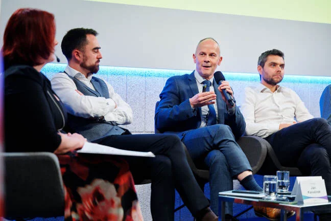 Náměstek ministra průmyslu a obchodu Jan Kavalírek (s mikrofonem), partner advokátní kanceláře White & Case Ivo Janda, Ondřej Kramoliš z Gen Digital, Luboš Král z Centra umělé inteligence ČVUT a Lukáš Loun z technologické společnosti Maia Labs v debatě během konference Právo a digitalizace. Vlevo moderátorka Alžběta Vejvodová, zástupkyně šéfredaktorky Ekonomického deníku. Foto: Radek Čepelák