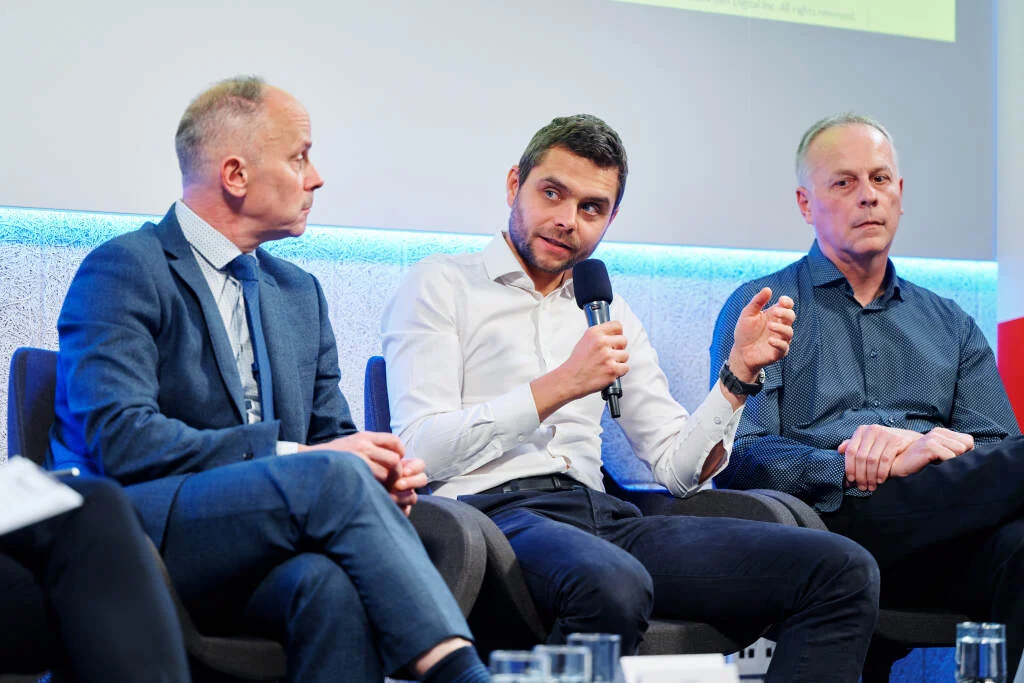 Senior Legal Counsel ve společnosti Gen Digital Ondřej Kramoliš hovoří o dopadu nové legislativy na obor AI. Nalevo partner White & Case Ivo Janda, napravo Luboš Král z Centra umělé inteligence ČVUT. Foto: Radek Čepelák