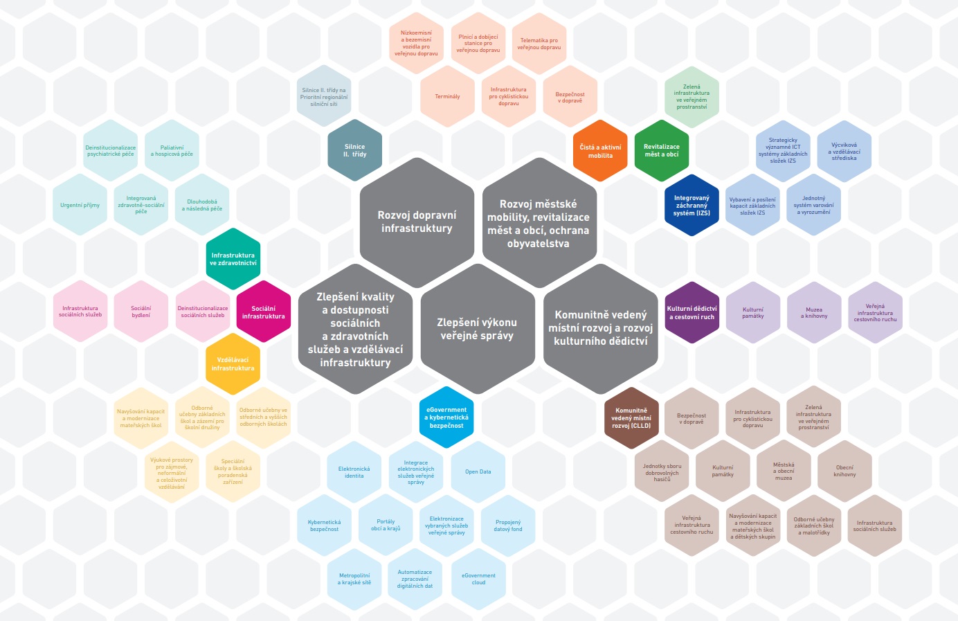 Měly by být podporovány oblasti jako je eGovernment a kyberbezpečnost, městská mobilita, včetně infrastruktury pro cyklodopravu, přestupní terminály, veřejná prostranství, Integrovaný záchranný systém, silnice II. třídy, regionální vzdělávání, sociální infrastruktura, zdravotnictví, kultura a cestovní ruch a také komunitně vedený místní rozvoj.