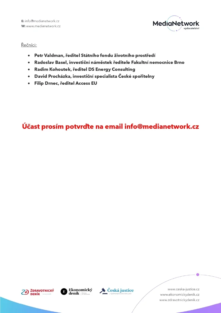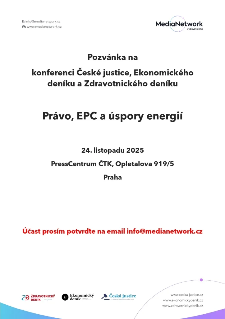 Jak nové legislativní změny ovlivní přípravu projektů? Kde jsou dnes největší bariéry, ale i největší příležitosti? Jaké dotační a úvěrové nástroje budou dostupné firmám, nemocnicím a státním institucím? Tato témata otevře odborná konference Právo, EPC a úspory energií, kterou 24. listopadu pořádají Česká justice, Ekonomický deník a Zdravotnický deník v PressCentru ČTK.