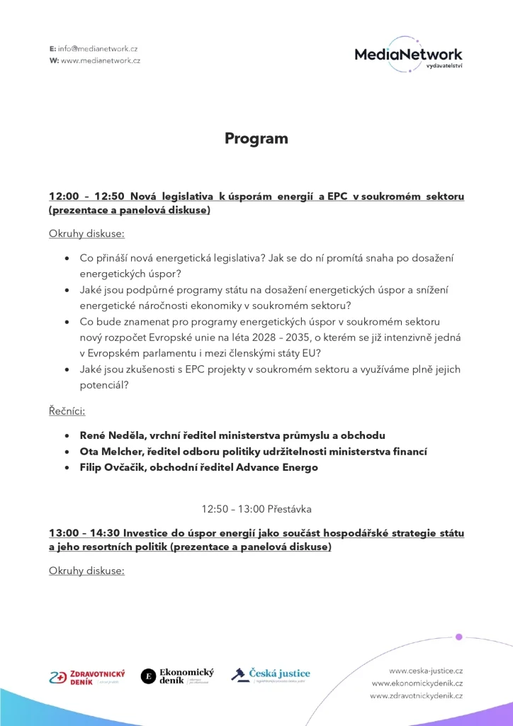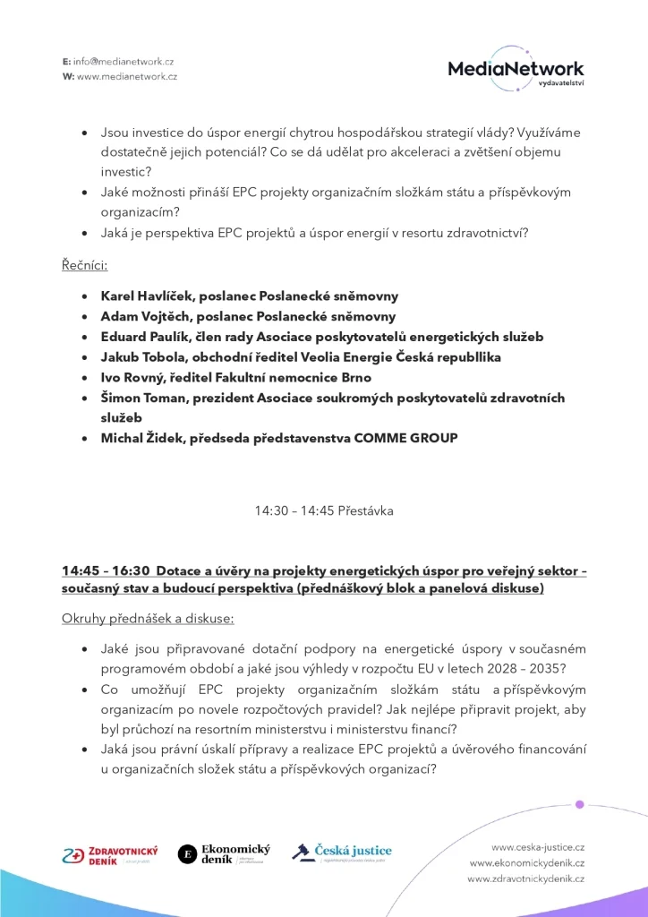 Diskuze se zaměří na rozdílné potřeby soukromých podniků, nemocnic i státní správy. Představeny budou připravované legislativní úpravy, programy podpory v současném i příštím programovém období EU a také praktické zkušenosti s EPC projekty.