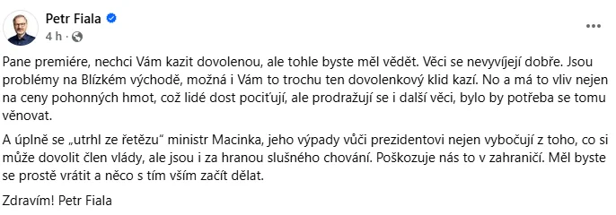 Hlavním terčem Fialovy kritiky je však ministr Macinka, který v nepřítomnosti premiéra zcela opustil diplomatický protokol. Jeho agresivní výpady vůči prezidentovi republiky jsou podle Fialy neomluvitelné.