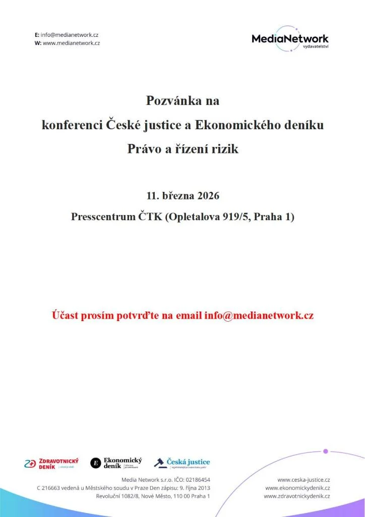 Konference Právo a řízení rizik propojí regulátory, zástupce pojišťoven, právní experty i specialisty na řízení rizik a nabídne prostor pro otevřenou debatu o budoucnosti sektoru. Pokud vás zajímá, jak legislativní změny ovlivní fungování pojišťovnictví a kudy se ubírá odpovědnost a řízení rizik v nemocnicích a dalších zdravotnických zařízeních, přijďte 11. března do PressCentra ČTK (Opletalova 919/5, Praha 1).
