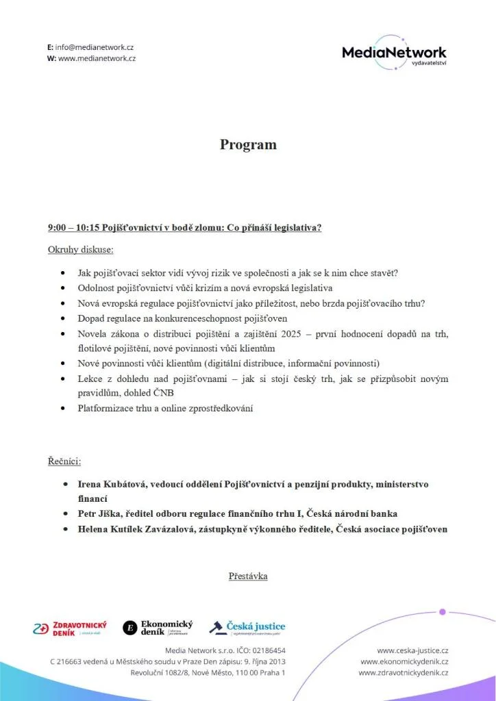 Pozvání do diskuse přijali zástupci klíčových institucí. Perspektivu veřejné správy a regulace přinesou Irena Kubátová z ministerstva financí a Petr Jiška z České národní banky. Pohled trhu představí Helena Kutílek Zavázalová z České asociace pojišťoven. Společně budou hledat odpověď na otázku, jak nastavit rovnováhu mezi ochranou spotřebitele, stabilitou trhu a jeho další konkurenceschopností.