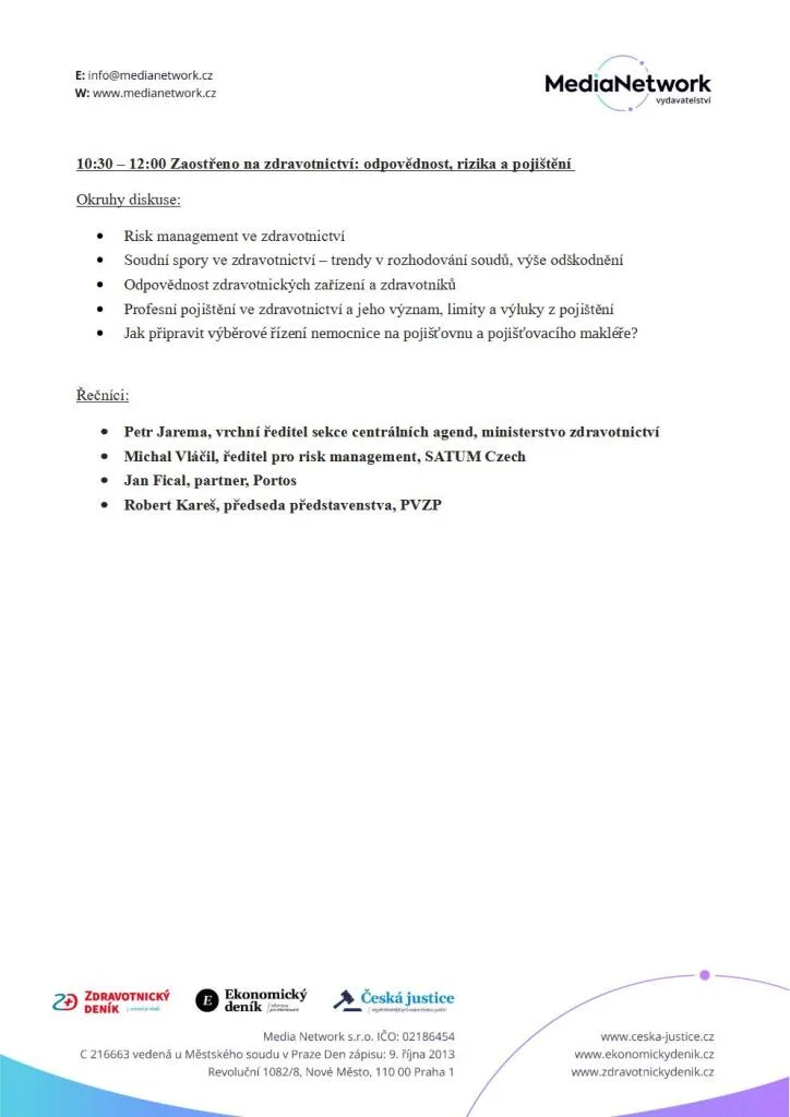 Druhá část konference se zaměří na zdravotnictví, kde se otázka odpovědnosti a pojištění stává stále citlivějším tématem. Rostoucí počet soudních sporů, proměňující se rozhodovací praxe soudů i výše přiznávaných odškodnění kladou na zdravotnická zařízení i jednotlivé zdravotníky vysoké nároky. Petr Jarema z ministerstva zdravotnictví, odborník na řízení rizik Michal Vláčil ze společnosti SATUM Czech, partner advokátní kanceláře Portos Jan Fical a Robert Kareš z Pojišťovny VZP nabídnou lekci z risk managementu. Na příkladech z praxe ukážou, kam až sahá odpovědnost poskytovatelů zdravotní péče či jak správně vysoutěžit a nastavit profesní pojištění.