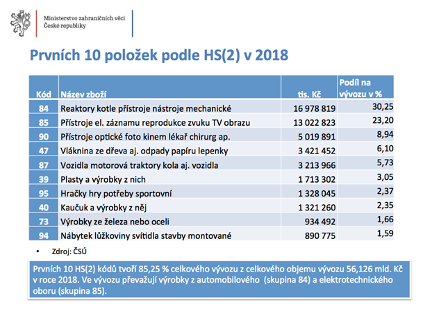 Česko by si mělo určit priority, se kterými sektory a zbožím se chceme na tento obrovský trh dostat a tyto segmenty pak podporovat a prosazovat. Mělo být se jednat o zboží s vyšší přidanou hodnotou a finální výrobky. Tuto snahu dokládá i seznam deseti hlavních položek našeho vývozu. Z velké části jsou to technologické části, elektrotechnické komponenty, částí automobilů s výjimkou vozidel, které se v Číně montují. Celková struktura našeho exportu do Číny však obsahuje relativně malý podíl hotových výrobků.