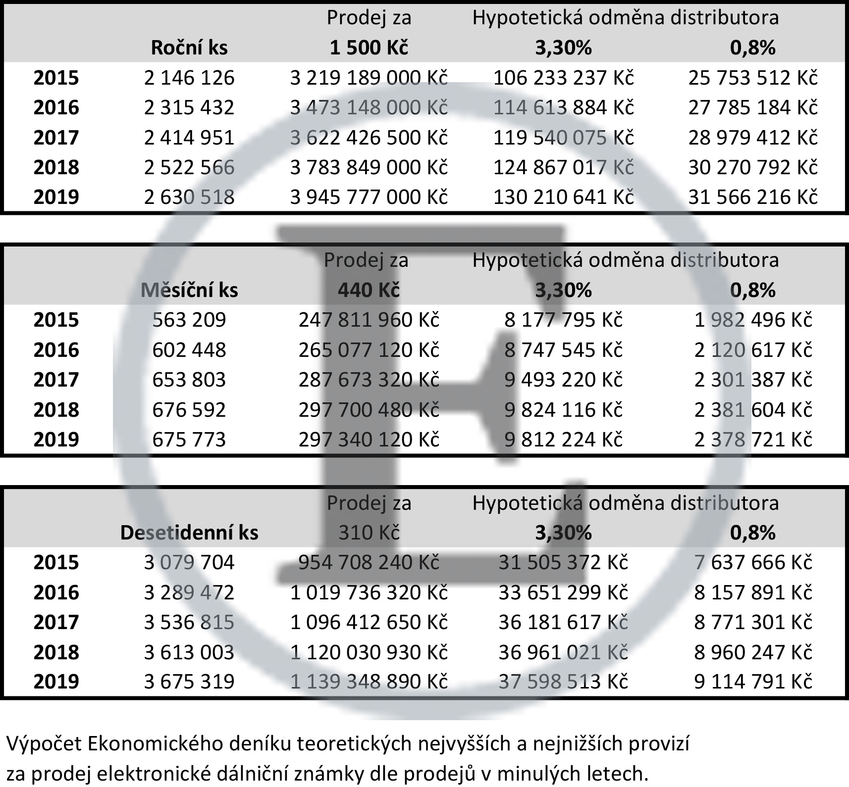 Státní fond dopravní infrastruktury také uvádí, kolik se dosud prodalo jednotlivých dálničních známek. Z toho redakce Ekonomického deníku vypočítala teoretickou výši provize pro distributora jak u maximální, tak u minimální sazby (za předpokladu, že by se všechny známky prodaly přes fyzickou distribuci. V reálu to bude okolo 60 %).