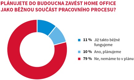 Čtyři pětiny dotázaných nemají do budoucna v plánu dále pokračovat v systému home office (80 %). Tato možnost oslovila pouze desetinu dotázaných, kteří plánují práci z domova zavést jako běžnou část jejich pracovního procesu (10 %), zbylá desetina již takovým způsobem funguje běžně (10 %).