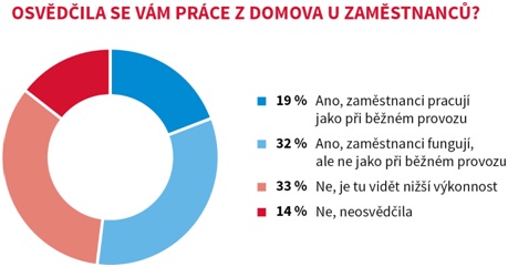 Další třetina zaznamenala, že zaměstnanci pracují dobře, ale nemohou své povinnosti plnit tak, jako při běžném provozu (32 %). Necelá pětina nezaznamenala žádné změny ve výkonnosti zaměstnanců (19 %) a nejmenší části z dotázaných se zavedení home office neosvědčilo vůbec, protože se setkali s nižší výkoností a horší kvalitou odvedené práce (14 %). Michal Vacek, ředitel společnosti CEEC Research, k tomuto dodává: „Pokud nejsou zaměstnanci na práci z domova zvyklí, může se dočasně snížit jejich výkonnost. Je důležité mít ale celý pracovní proces přizpůsobený takovému pracovnímu stylu, a to například kvalitní digitalizací interních procesů.“