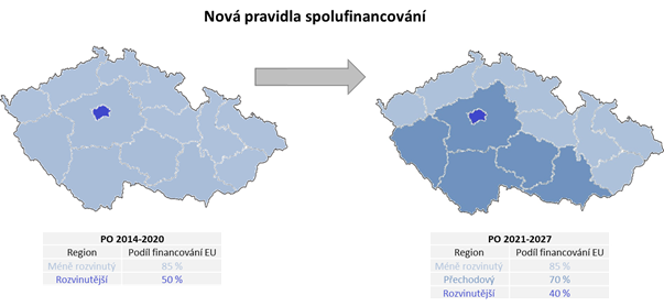 Přechod do nového programového období 2021-2027 pro projekty financované z prostředků EU sebou přináší nová pravidla spolufinancování. Změna souvisí se zvýšením bohatství České republiky a jednotlivých jejích regionů, protože na projektech financových z prostředků EU se evropské peníze podílejí vždy právě podle rozvinutosti příslušných území.