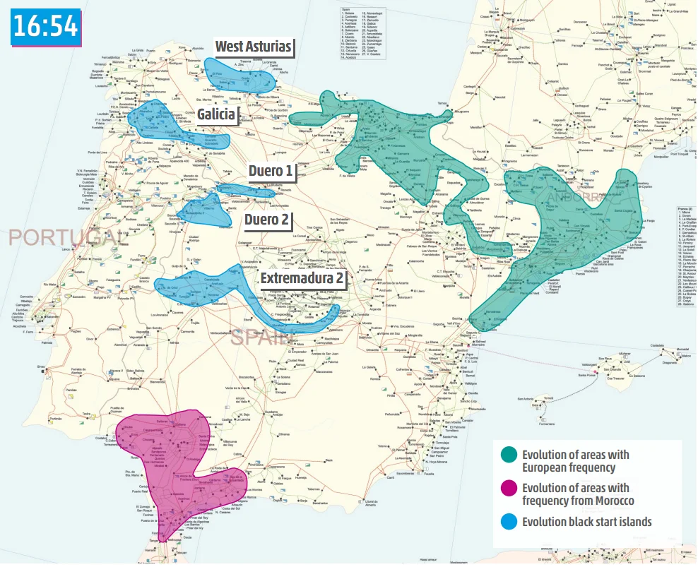 Oblasti Španělska, které měly jako první dodávku elektřiny díky výpomoci Francie, Maroka a ostrovnímu provozu vodních elektráren. Zdroj: zpráva ENTSO-E