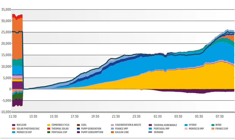aktivace přepěťové ochrany. Jen o pár vteřin později se něco podobného odehrálo v rozvodně u Badajozu. Pak už nastala kaskádová reakce, v důsledku přepěťové ochrany či jiných příčin došlo k odpojení solárních a větrných elektráren v Segovii, Huelvě, Seville a Cáceresu. Jinak to ani dopadnout nemohlo, napětí před odpojením dosahovalo až 435 kilovoltů (kV) místo standardních 400 kV.