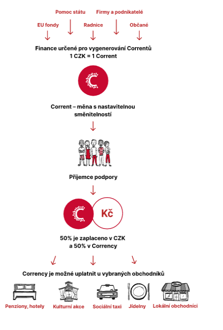„Víme, že existují fondy v rámci Evropské unie, které by měly být určeny pro rozdělování osobám postiženým nouzí v souvislosti s covidem. Dále to mohou být privátní peníze, nebo to budou peníze obcí nebo jiných municipalit. Nebo to mohou být tzv. „vertikální emise“. Například by majitel řetězce hotelů mohl dát slevu všem turistům, kteří přijedou do jeho hotelu. Nejpravděpodobnější se nám zdá, že by to ale mohlo fungovat podobně, jako teď v Kyjově, rozhýbat pomocí correntů místní ekonomiku,“ vysvětluje možnosti rozvoje systému Rafaj. Dokáže si představit, že by se jeho systém dal „naroubovat“ i na kampaň MMR pro podporu domácího cestovního ruchu. „Ministerstvo, nebo CzechTourism by mohli stanovit, že každý, kdo má v transakci kód ubytování v ČR, tak by mohl být příjemcem této slevy,“ dodává Rafaj.