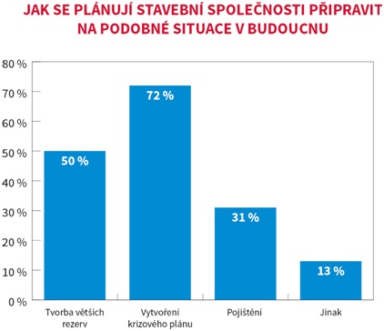 Na podobné situace se do budoucna plánuje připravit 49 % dotázaných projektových společností a 62 % dotázaných stavebních společností. Projektové společnosti plánují do budoucna tvorbu větších rezerv (59 %) či vytvoření krizového plánu pro podobné nečekané situace (52 %). Menší jejich část se potom přikloní ke sjednání pojištění (15 %) nebo k jiným možnostem, jako je např. snížení provozních nákladů (19 %). U stavebních společností, které se plánují v budoucnu na podobné situace připravit, bude v největší míře připraven krizový plán (72 %) a polovina firem plánuje tvořit i větší finanční rezervy (50 %). Téměř třetina plánuje sjednat pojištění (31 %). K jinému řešení, než jsou výše uvedená, se uchýlí 13 % společností.