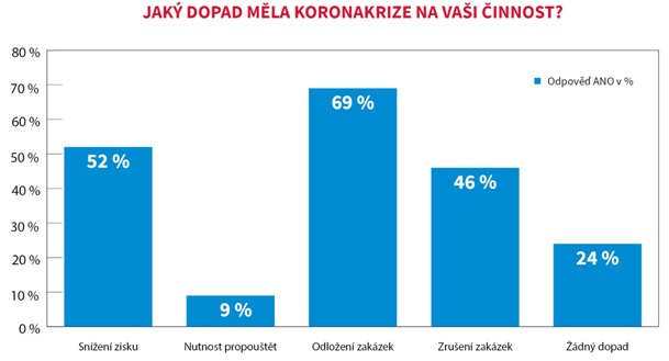 Necelá polovina dotázaných potom čelila situaci, kdy byla zrušena celá zakázka (46 %). V průměru se jednalo o 16 % zrušených zakázek vlivem koronakrize. Pozitivní zprávou je, že čtvrtina dotázaných nepocítila žádný z dopadů uváděných výše. Roman Voráč, ředitel technického rozvoje společnosti SUDOP GROUP a.s., sdílí svoji zkušenost, kdy dopadem krize byla spolupráce s ostatními subjekty projektu, kteří nebyli na krizi připraveni: „Z technického hlediska se nám podařilo s krizí vypořádat bez zjevného problému. SW nástroje i způsob organizace pracovní činnosti, který v rámci skupiny využíváme, umožňují bezproblémovou vzdálenou spolupráci, která je navíc zabezpečena na nejvyšší úrovni. Každý pracovník tak mohl nadále bez problému pracovat na zakázkách, kterým se musel věnovat. Větší problém byl v rámci spolupráce s ostatními subjekty projektu, kteří připraveni nebyli. Po lidské stránce byl samozřejmě cítit psychický tlak u každého z nás a období to bylo náročné. Nicméně se nám obecně podařilo krizi v dobré kondici překonat a dnes se z této zkušenosti snažíme ponaučit do budoucna, abychom uměli reagovat na jakoukoliv budoucí vlnu korona či jiné krize.“