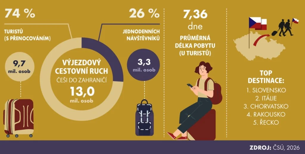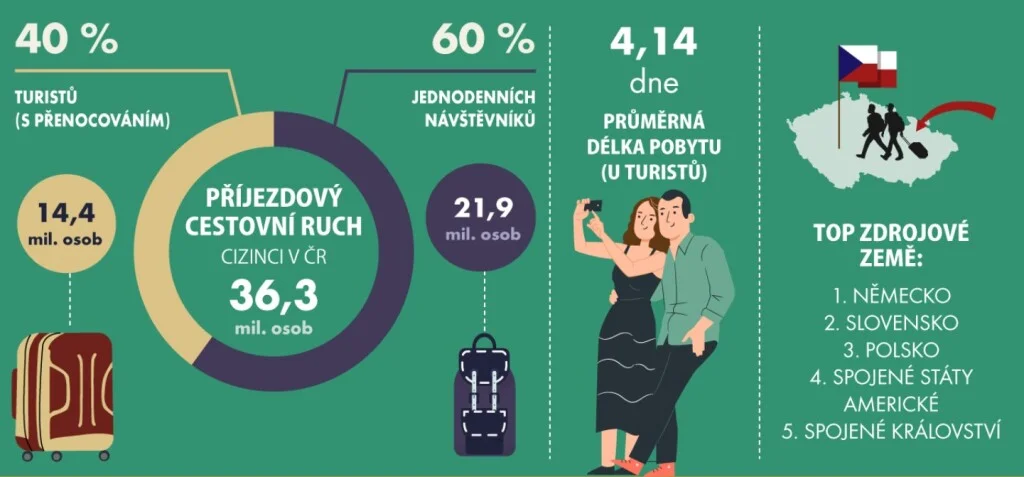 Podle dat ČSÚ před dvěma lety navštívilo Česko 36,3 milionu zahraničních návštěvníků, přičemž 40 procent z nich v zemi i přenocovalo, 60 procent pobylo jen jeden den. Nejvíce turistů přijelo do ČR z Německa, Slovenska, Polska, USA a Británie.