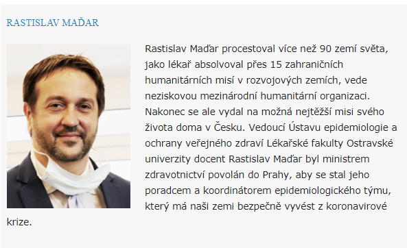 Na začátku jsem skutečně spíše reagoval za instituce či specializace, které reprezentuji, tedy za Lékařskou fakultu Ostravské univerzity, za cestovní medicínu apod. Vyjadřoval jsem i osobní názory na twitteru, spíše uklidňující a zasazující dění do kontextu. Z té jediné sítě, na které jsem dosud byl, jsem se ale odpojil. Mám totiž pocit, že úroveň diskuse se tam zhoršila a nemám na to ani časovou kapacitu. Pan ministr si všímal mých názorů a asi vnímal, že se hodí slyšet je častěji ve svém nejbližším okolí. I kvůli minulé paní hlavní hygieničce, která soji roli nezvládala. Tento post byl najednou v těžké pandemické době důležitý více než jindy. I proto mě zřejmě jmenoval svým externím poradcem. Je to naprosto dobrovolná, neplacená funkce, která samozřejmě předpokládá, že náš provoz v ordinacích je nyní snížený a že mě zastupují kolegové, abych se mohl uvolňovat pro ministerstvo a přitom neutrpěli naši pacienti.