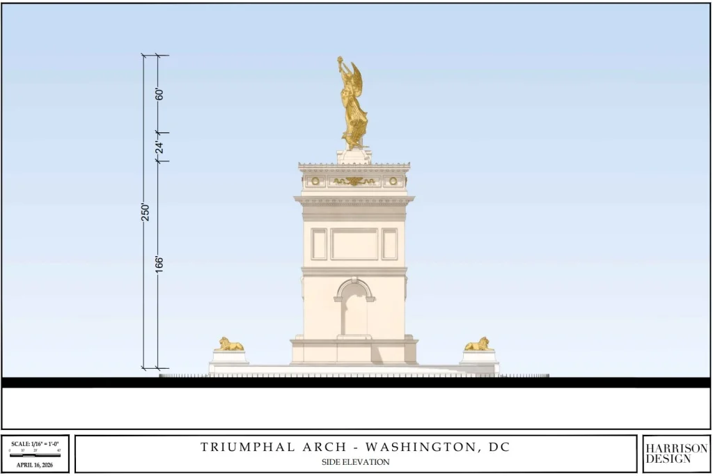 Návrhy počítají s obloukem v barvě slonové kosti, který se inspiroval římským Titovým obloukem a připomíná Vítězný oblouk v Paříži. Má být vysoký symbolických 250 stop, tedy 76 metrů. Součástí návrhu jsou také zlaté dekorativní prvky včetně 18 metrů vysoké sochy na vrcholu připomínající Sochu svobody s andělskými křídly. Ta má po stranách dvě sochy orlů vysoké přes 7 metrů (24 stop).