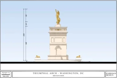 Návrhy počítají s obloukem v barvě slonové kosti, který se inspiroval římským Titovým obloukem a připomíná Vítězný oblouk v Paříži. Má být vysoký symbolických 250 stop, tedy 76 metrů. Součástí návrhu jsou také zlaté dekorativní prvky včetně 18 metrů vysoké sochy na vrcholu připomínající Sochu svobody s andělskými křídly. Ta má po stranách dvě sochy orlů vysoké přes 7 metrů (24 stop).