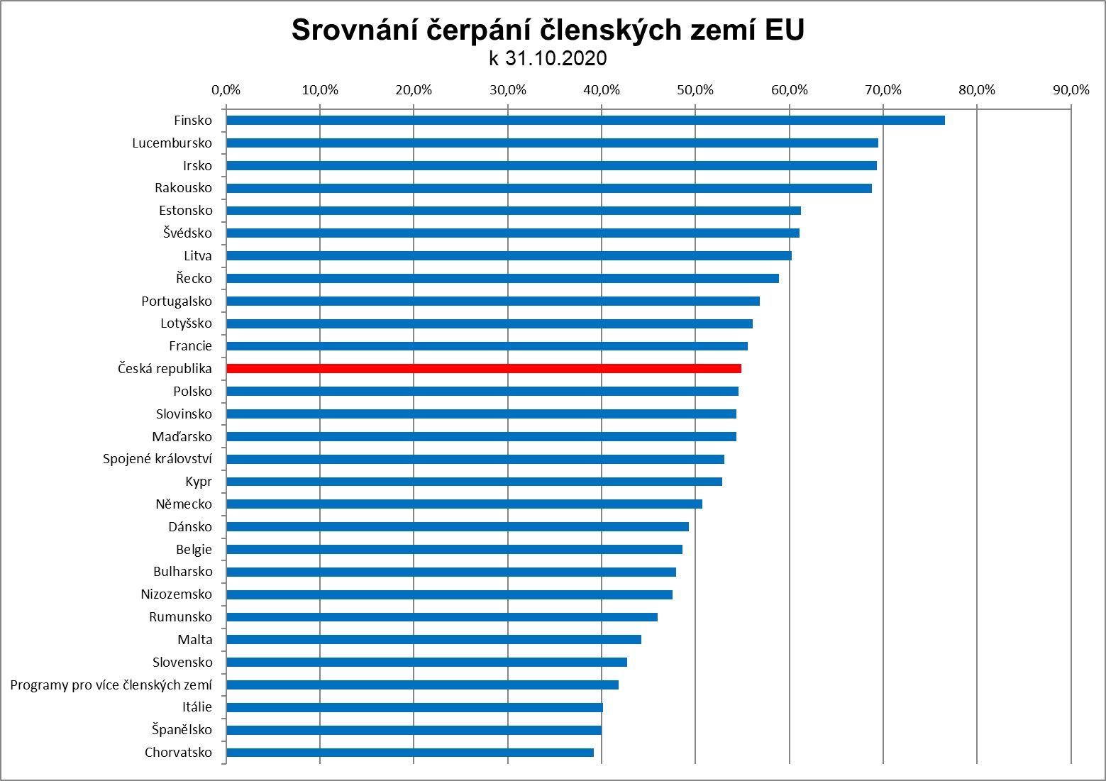 Česká republika znovu zrychlila čerpání financí z fondů EU a v žebříčku států evropské osmadvacítky je nyní na 12. místě. V úspěšnější polovině zemí se Česko drží už od letošního jara. Žebříček porovnává reálně proplácené prostředky z fondů EU Evropskou komisí. Ke konci listopadu bylo českým příjemcům proplaceno více než 372 miliard korun – více než 58 % z celkové alokace současného programového období.