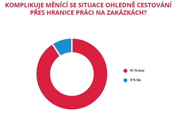 Dotázané stavební společnosti také uvádí, že v průměru byly nuceny odložit termín realizace u 36 % všech svých zahraničních zakázek. Dalších 37 % těchto zakázek bylo potom zcela zrušeno. Devět z deseti stavebních společností také uvádí, že často se měnící a mnohdy nejasná zaváděná opatření komplikují cestování tzv. pendlerů, což má dopad na realizaci zakázek a na vytíženost kapacit stavebních společností (91 %). Obtíže spojené s cestováním za hranice má také Ivo Luňák, jednatel společnosti Tyros Loading Systems: „Vlastní dodávky neklesly ba naopak a dodáváme naše průmyslová vrata jak do států Evropské unie, tak mimo. Omezení jsme byli a jsme v posílání našich projekt manažerů a šéfmontérů.“