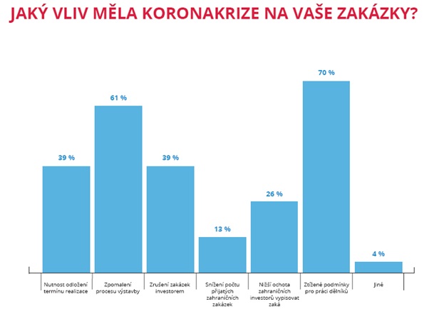 Zahraniční zakázky byly ovlivněny několika způsoby. Nejvíce se dotázané stavební společnosti setkávaly se ztíženými podmínkami pro práci dělníků, jako je například jejich cestování, práce na stavbě apod. (70 %). Tři pětiny dotázaných se také setkaly se zpomalením procesu výstavby (61 %). Dvě pětiny společností také byly nuceny u zahraničních zakázek odložit termín realizace, nebo se setkaly se zrušením celé zakázky ze strany investora (obojí shodně 39 %). Čtvrtina dotázaných také pociťuje nižší ochotu zahraničních investorů vypisovat zakázky (26 %) a více jak desetina dotázaných přijala do počátku koronakrize méně zahraničních zakázek (13 %). Dopady krize jsou cítit také v sousedních státech, jak popisuje Jiří Weis, obchodní a marketingový ředitel společnosti HELUZ: „Naše zahraniční aktivity jsou zaměřeny na sousední trhy. Zde jsme zaznamenali mírné zpomalení výstavby, zejména zpomalení přípravných prací staveb, spojené s chybějící pracovní silou.“