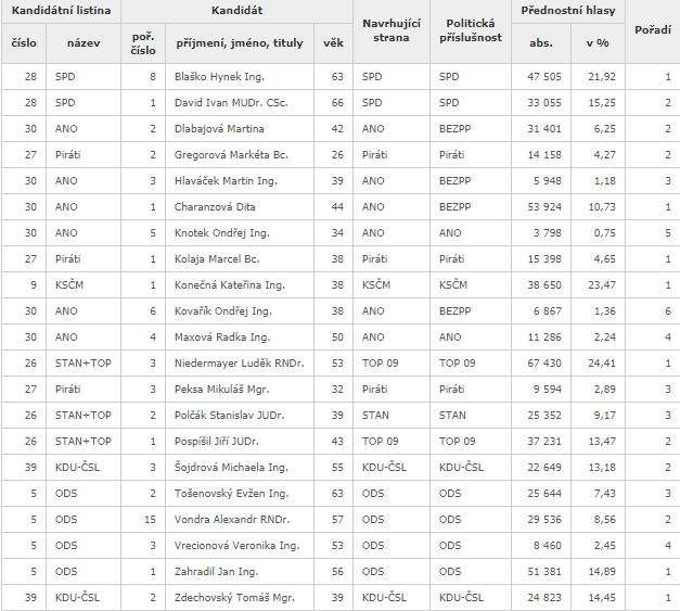 3 mandáty), Starostové (STAN) s regionálními partnery a TOP 09 (11,65 %, 3 mandáty), Svoboda a přímá demokracie – Tomio Okamura (SPD) (9,14 %, 2 mandáty), Křesťanská