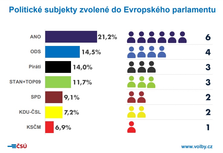 Historicky nejvyšší účast 28,72 % zaznamenali volební komisaři v Evropských volbách. Naprosto propadla ČSSD, která nezískala ani jeden mandát. Končí tak europoslanec Pavel Poc, který vedl kandidátku i jeho kolegyně Olga Sehnalová. Vítězem se podle očekávání stalo hnutí ANO (21,2 %), které získalo 6 mandátů (obhajovalo 4), na druhém místě je ODS se 14,5 % a čtyřmi mandáty. Překvapením můžeme nazvat zvolení Alexandra Vondry, který kandidoval z 15. místa a stal se tak „skokanem“ těchto voleb. Třetí Piráti získali 14 % a 3 europoslance, STAN+TOP 09 dostali 11,7 % a tři místa v Evropském parlamentu, SPD získala 2 místa a 9,1 % – zde uspěl generálmajor v záloze Hynek Blaško, KDU-ČSL dostala 7,2 % a dvě místa, poslední, kdo se dostal do Evropského parlamentu je stávající europoslankyně Kateřina Konečná za KSČM.