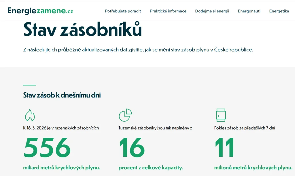 Podle zmíněného webu byly tuzemské zásobníky v minulém týdnu naplněny na 16 procent. Podle databáze AGSI+ na webu asociace GIE naplněnost zásobníků na českém území k 19. březnu dosahovala 29,6 procenta provozní kapacity. Po odečtení zásobníku SPP Storage, který slouží hlavně pro potřeby Slovenska, podíl vychází na zhruba 22 procent.
